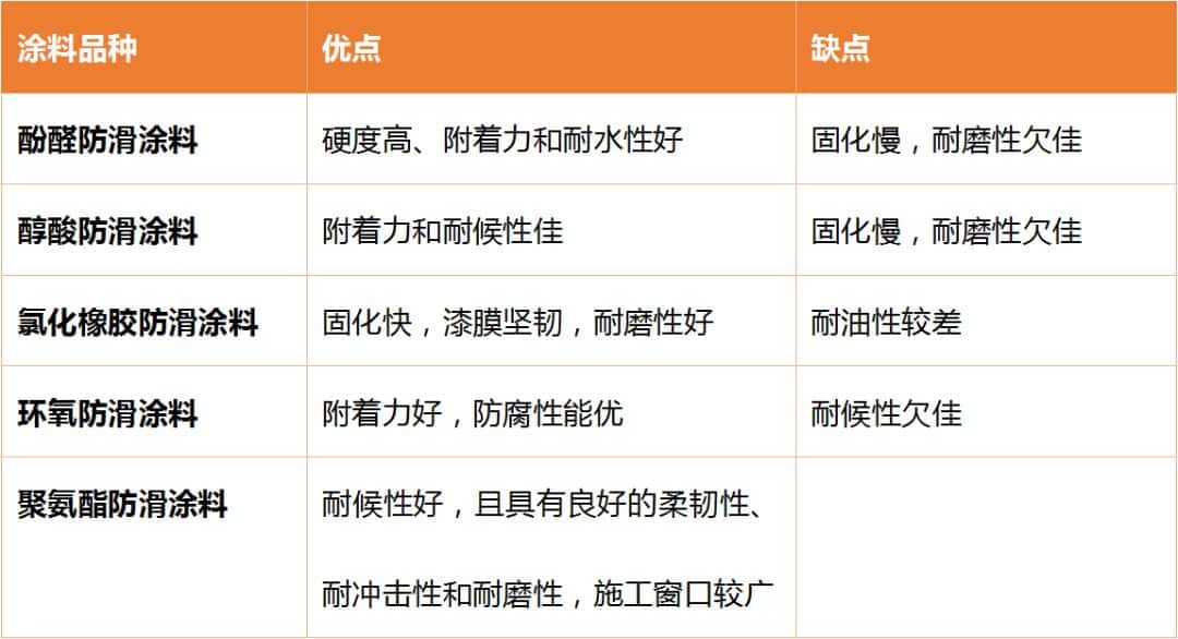 按成膜物质的种类,防滑涂料可以分为酚醛防滑涂料、环氧防滑涂料、氯化橡胶防滑涂料、醇酸防滑涂料和聚氨酯防滑涂料等。环氧防滑涂料和聚氨酯防滑涂料的应用最为广泛。
